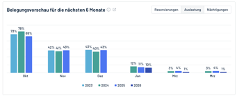 + Belegungsvorschau für die nächsten 6 Monate: Diese Grafik zeigt die Belegung für die kommenden sechs Monate auf Basis bestätigter Reservierungen; Optionen und Stornierungen sind ausgeschlossen. Der Vergleich erfolgt mit dem gleichen Zeitraum der beiden Vorjahre, jeweils bezogen auf den heutigen Stichtag.