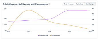 + Entwicklung von Nächtigungen und Öffnungstagen: Diese Grafik zeigt die Entwicklung der gesamten Übernachtungen und Öffnungstage in den letzten Jahren. Die Übernachtungen werden auf der rechten Achse dargestellt, die Öffnungstage pro Jahr auf der linken Achse.