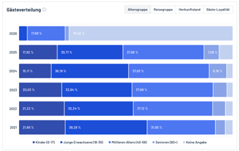 + Gästeverteilung nach Altersgruppe, Reisegruppe, Herkunftsland, Gäste-Loyalität: Reservierungen werden dem Aufenthaltsjahr zugeordnet, nicht dem Buchungsdatum.