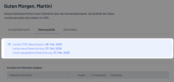 - Neue Importdaten im Bereich Datenqualität: Mit „Letzte neue Reservierung“ und „Letzte geupdatete Reservierung“ stehen zwei neue Zeitstempel in der Datenqualitäts-Sektion zur Verfügung. Diese helfen dabei zu prüfen, ob Buchungsdaten aktuell sind und wann die letzte Synchronisierung erfolgt ist.
